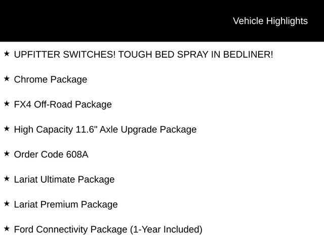 All advertised prices EXCLUDE optional equipment selected by the purchaser, dealer documentation fee of $699 per TCA 55-17-114, and state and local taxes, tags, registration and title fees. Advertised prices INCLUDE factory-installed options installed by the manufacturer and dealer-installed accessories already installed on the vehicle by the dealer at time of advertising. For new vehicles, advertised price also includes MSRP and factory transportation costs. All prices include any rebates and incentives for which all consumers qualify. If no advertised price is provided, contact dealer for details. Chrome Package (6 Angular Bright Anodized Step Bars, Chrome Door Handles, Chrome Exhaust Tip, Unique Chrome Mirror Caps, and Wheels: 20 Chrome PVD Aluminum), Ford Connectivity Package (1-Year Included), FX4 Off-Road Package (Hill Descent Control, Off-Road Specifically Tuned Shock Absorbers, and Unique FX4 Off-Road Box Decal), High Capacity 11.6 Axle Upgrade Package, Internet access capable: 5G Modem - Ford Connectivity Package, Lariat Premium Package (Privacy Glass, Pro Trailer Backup Assist, and Pro Trailer Hitch Assist), Lariat Ultimate Package (4-Way Adjustable Headrests, Head-Up Display, Power-Deployable Running Boards, and Radio: B&O Unleashed Sound System by Bang & Olufsen), Order Code 608A (Flow-Through Console and Front ActiveX Trimmed 40/Console/40 Seats), Navigation system: Connected Navigation, 4-Wheel Disc Brakes, 8 Speakers, ABS brakes, Adjustable pedals, Air Conditioning, Alloy wheels, AM/FM radio: SiriusXM with 360L, Auto High-beam Headlights, Auto-dimming Rear-View mirror, Automatic High Beam, Automatic temperature control, Brake assist, Bumpers: chrome, Compass, Delay-off headlights, Driver door bin, Driver vanity mirror, Dual AGM 68 AH Battery, Dual front impact airbags, Dual front side impact airbags, Electronic Stability Control, Emergency communication system: SYNC 4 911 Assist, Front Price includes: $500 - 2026 Farm Bureau Recognition Exclusive Cash Reward. Exp