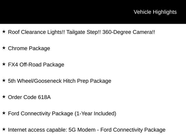 All advertised prices EXCLUDE optional equipment selected by the purchaser, dealer documentation fee of $699 per TCA 55-17-114, and state and local taxes, tags, registration and title fees. Advertised prices INCLUDE factory-installed options installed by the manufacturer and dealer-installed accessories already installed on the vehicle by the dealer at time of advertising. For new vehicles, advertised price also includes MSRP and factory transportation costs. All prices include any rebates and incentives for which all consumers qualify. If no advertised price is provided, contact dealer for details. 5th Wheel/Gooseneck Hitch Prep Package, Chrome Package (6 Angular Bright Anodized Step Bars, Chrome Door Handles, Chrome Exhaust Tip, Unique Chrome Mirror Caps, and Wheels: 20 Chrome PVD Aluminum), Ford Connectivity Package (1-Year Included), FX4 Off-Road Package (Hill Descent Control, Off-Road Specifically Tuned Shock Absorbers, and Unique FX4 Off-Road Box Decal), Internet access capable: 5G Modem - Ford Connectivity Package, Order Code 618A (Flow-Through Console and Front ActiveX Trimmed 40/Console/40 Seats), Navigation system: Connected Navigation, 190 Amp Alternator, 4-Wheel Disc Brakes, 8 Speakers, ABS brakes, Adjustable pedals, Air Conditioning, Alloy wheels, AM/FM radio: SiriusXM with 360L, Auto High-beam Headlights, Auto-dimming Rear-View mirror, Automatic temperature control, Brake assist, Bumpers: chrome, Compass, Delay-off headlights, Driver door bin, Driver vanity mirror, Dual AGM 68 AH Battery, Dual front impact airbags, Dual front side impact airbags, Electronic Stability Control, Emergency communication system: SYNC 4 911 Assist, Front anti-roll bar, Front Bucket Seats, Front Center Armrest, Front dual zone A/C, Front fog lights, Front License Plate Bracket, Front reading lights, Fully automatic headlights, Garage door transmitter, Heated door mirrors, Heated front seats, Heated rear seats, Heated steering wheel, Illuminated entry, LED Roof Clearance Lights, Low tire pressure warning, Memory seat, Outside temperature display, Overhead airbag, Overhead console, Panic alarm, Passenger door bin, Passenger vanity mirror, Pedal memory, Power d Price includes: $500 - 2026 Farm Bureau Recognition Exclusive Cash Reward. Exp