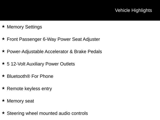 - Memory settings recalls presets for driver power seat adjuster and pedals (When (PCK) Luxury Package or (PDA) Texas Edition Package are ordered, also includes memory presets for outside rearview mirrors and power steering column.)