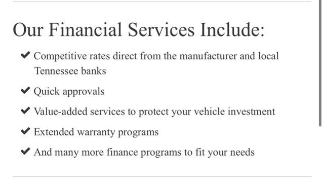 If provided, Advertised Price EXCLUDES all optional dealer offered items, accessories, or product addendums optionally selected by the purchaser, dealer document processing fee of $799 per TCA 55-17-114, and state and local taxes, tags, registration and title fees. Advertised prices INCLUDE factory-installed options installed by the manufacturer and non-optional dealer-installed accessories already installed on the vehicle by the dealer at time of advertising. For new vehicles, advertised price also includes MSRP and factory transportation costs. By submitting your information, you consent to receive all forms of communication including but not limited to phone, text, email, mail, etc. Message and data rates may apply. Consent to these terms is not a condition of purchase. You may opt out at any time. MPG based on model year EPA mileage ratings. Use for comparison purposes only. Discounts and incentives may be available to all of the general public, or may have certain conditions, such as being financed through a required specific lender, call Dealer for details. Certain used vehicles may be subject to important Wholesale to the Public disclosures provided to you prior to purchase; please consider carefully before your purchase decision. The Lifetime Limited Powertrain Warranty is offered on select vehicle makes and models. Not all vehicles qualify. Ask your dealership sales representative for details.