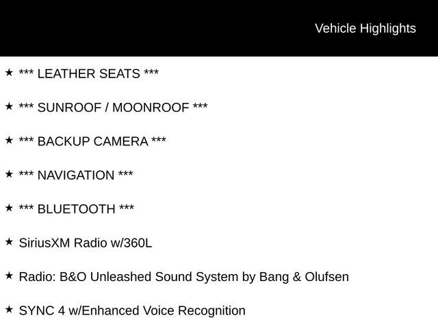 Step inside and you'll be surrounded by a wealth of premium features that elevate the driving experience. Sink into the plush leather-trimmed seats and enjoy the convenience of the SYNC 4 infotainment system, complete with navigation and a premium Bang & Olufsen sound system. The twin-panel power moonroof lets you bask in natural light, while the heated and ventilated front seats and heated rear seats keep you comfortable in any weather.