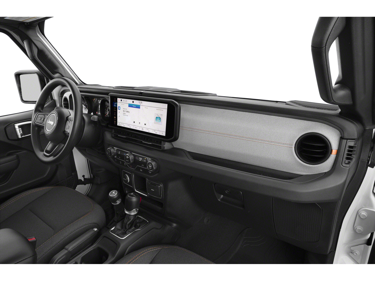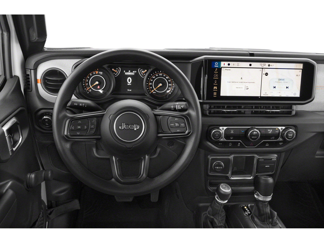 The Gladiator Sport's exterior is dressed in a sleek Granite Crystal Metallic Clearcoat, complemented by a Black 3-Piece Hard Top and a MOPAR Spray In Bedliner, ensuring both style and functionality. Inside, the cabin is outfitted with a host of premium features, including a 12.3 Touchscreen Display, Apple CarPlay, Android Auto, and a WIFI Hotspot, keeping you connected and entertained on every journey.